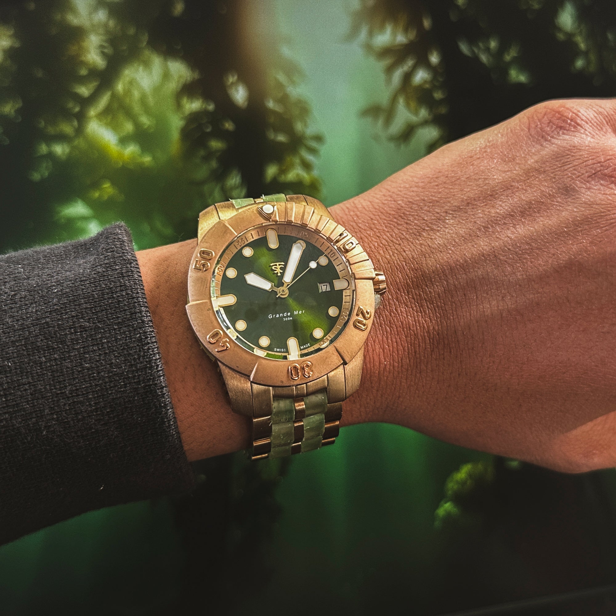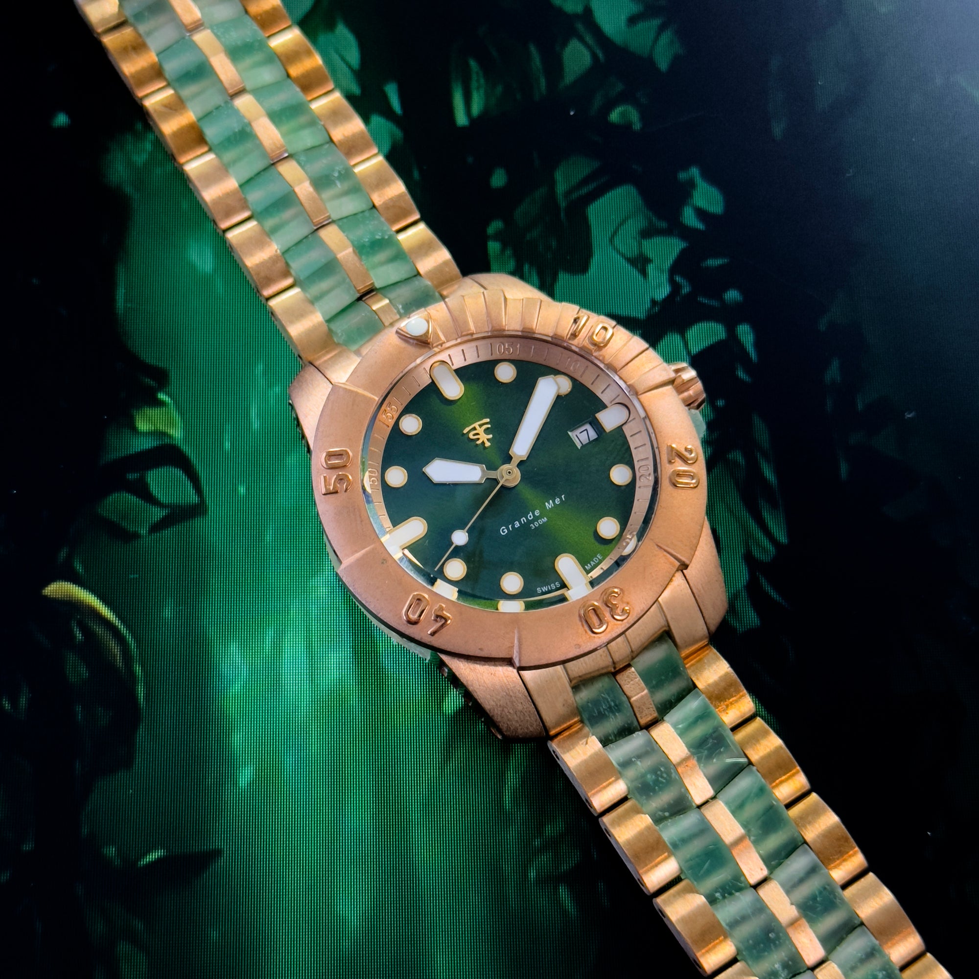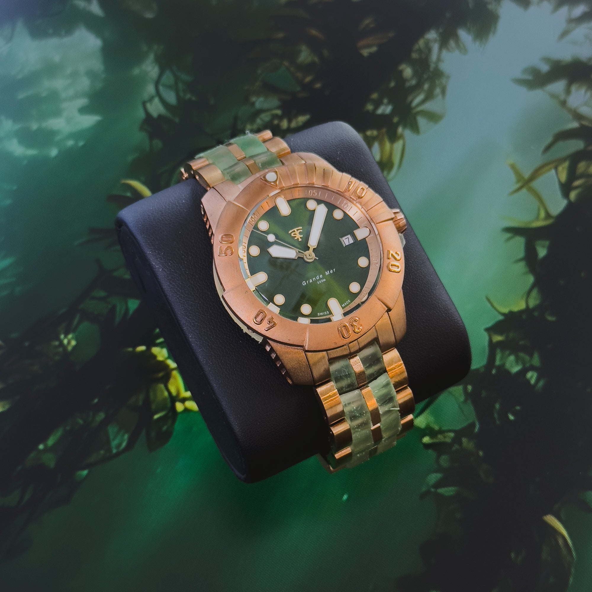 This model features our 44mm reclaimed bronze case with an emerald green sunray dial and a bronze chapter ring, bronze hands and a lollipop seconds hand with white lum fill. The bracelet links are reclaimed bronze and "seaglass" - our custom resin made with reclaimed ghosts nets (old nylon fishing nets we take from the sea) with a bronze buckle.