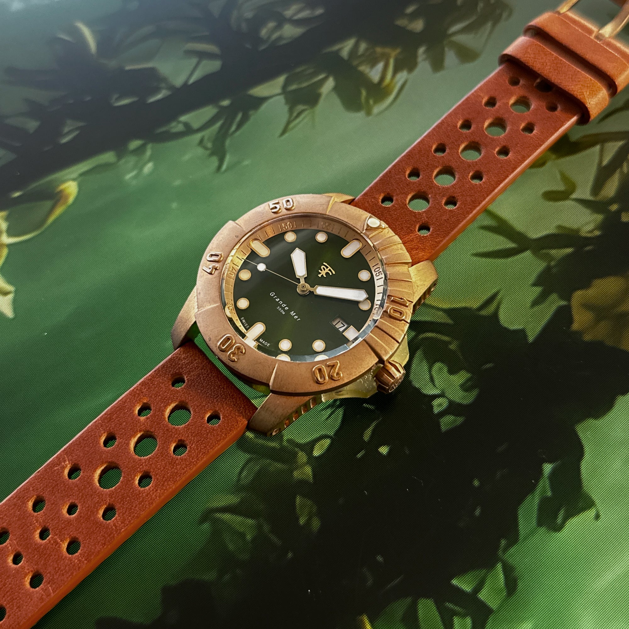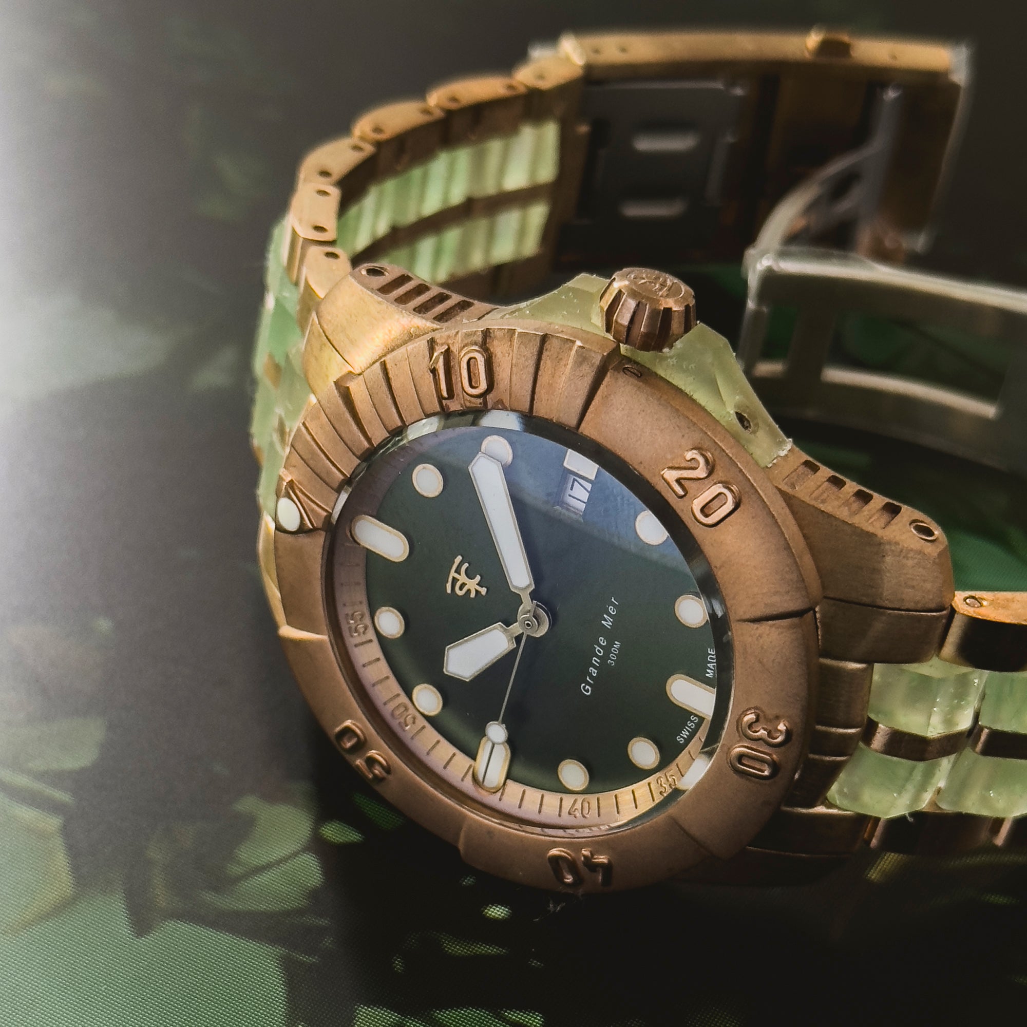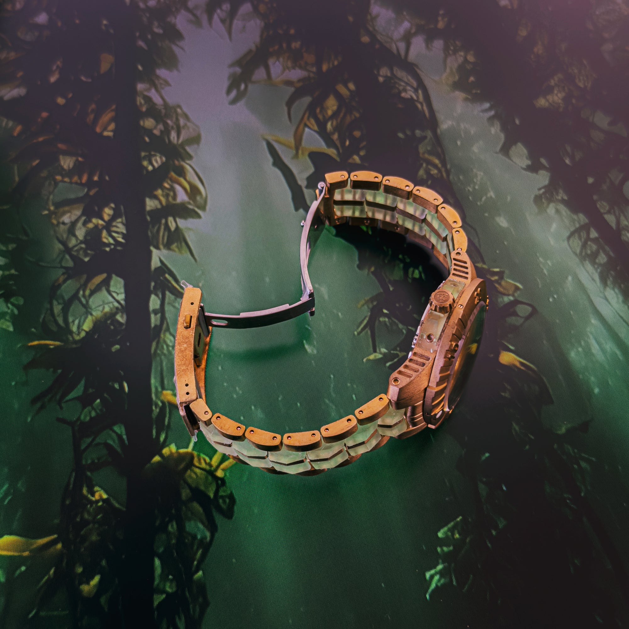 This model features our 44mm reclaimed bronze case with an emerald green sunray dial and a bronze chapter ring, bronze hands and a lollipop seconds hand with white lum fill. The bracelet links are reclaimed bronze and "seaglass" - our custom resin made with reclaimed ghosts nets (old nylon fishing nets we take from the sea) with a bronze buckle.
