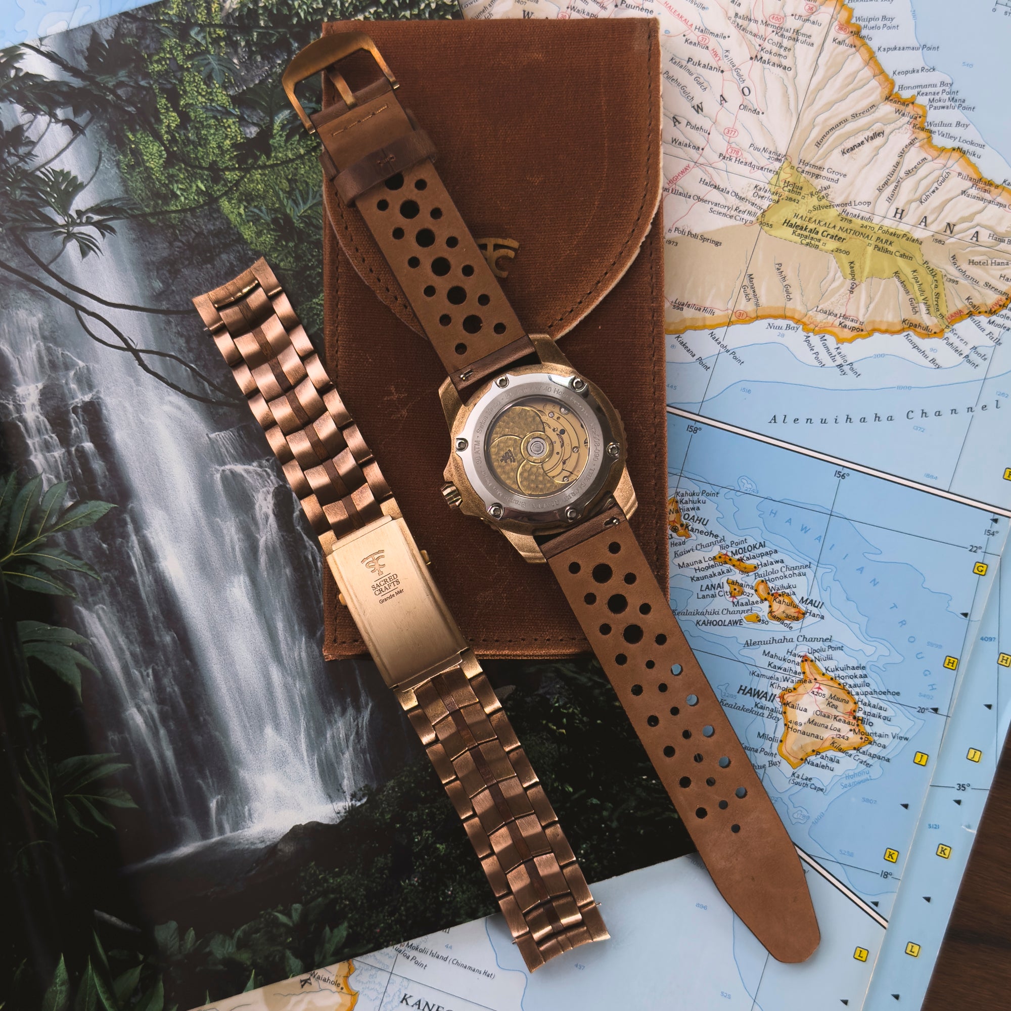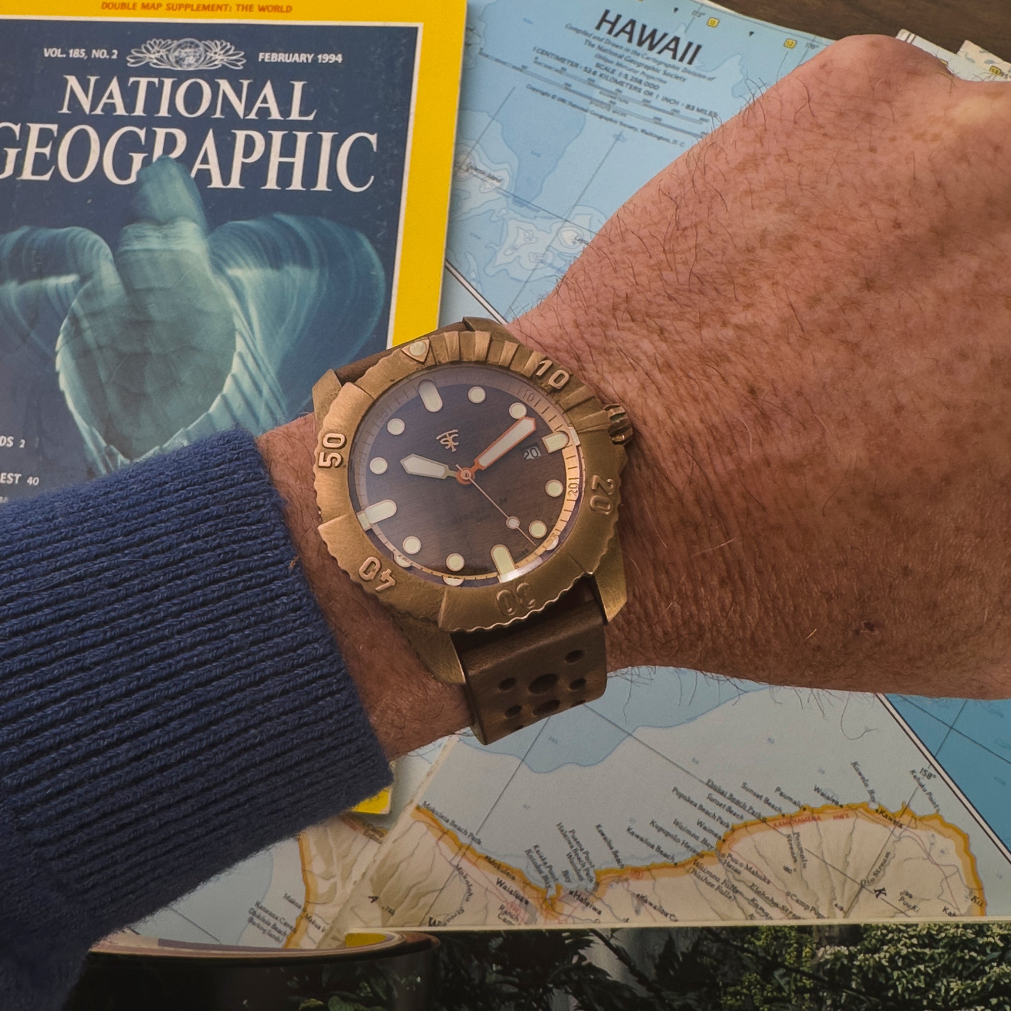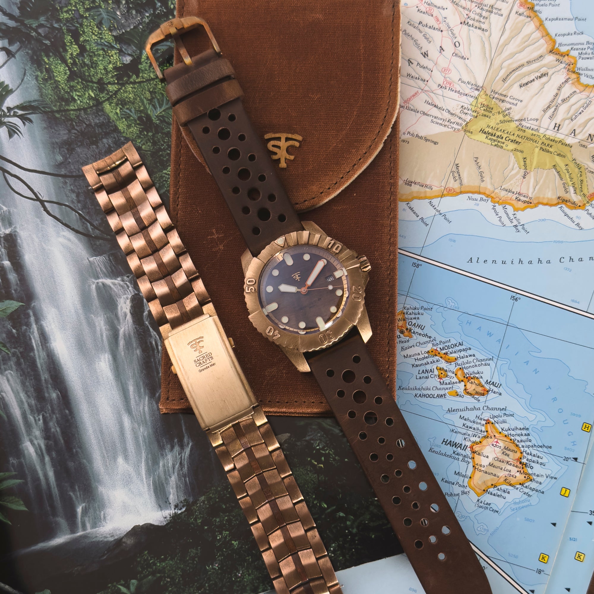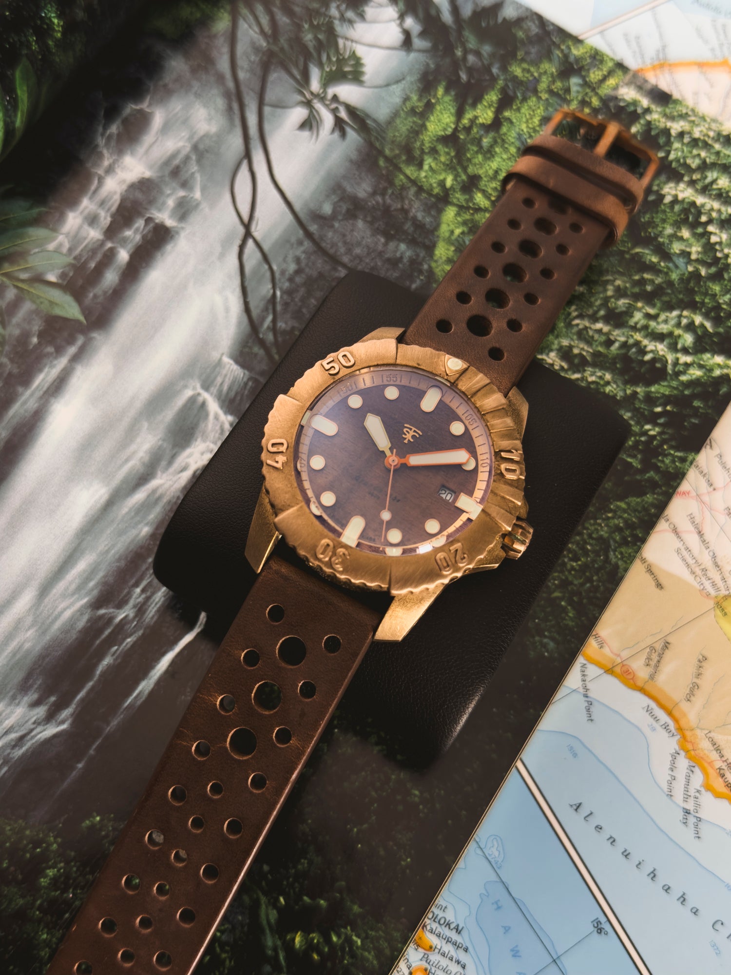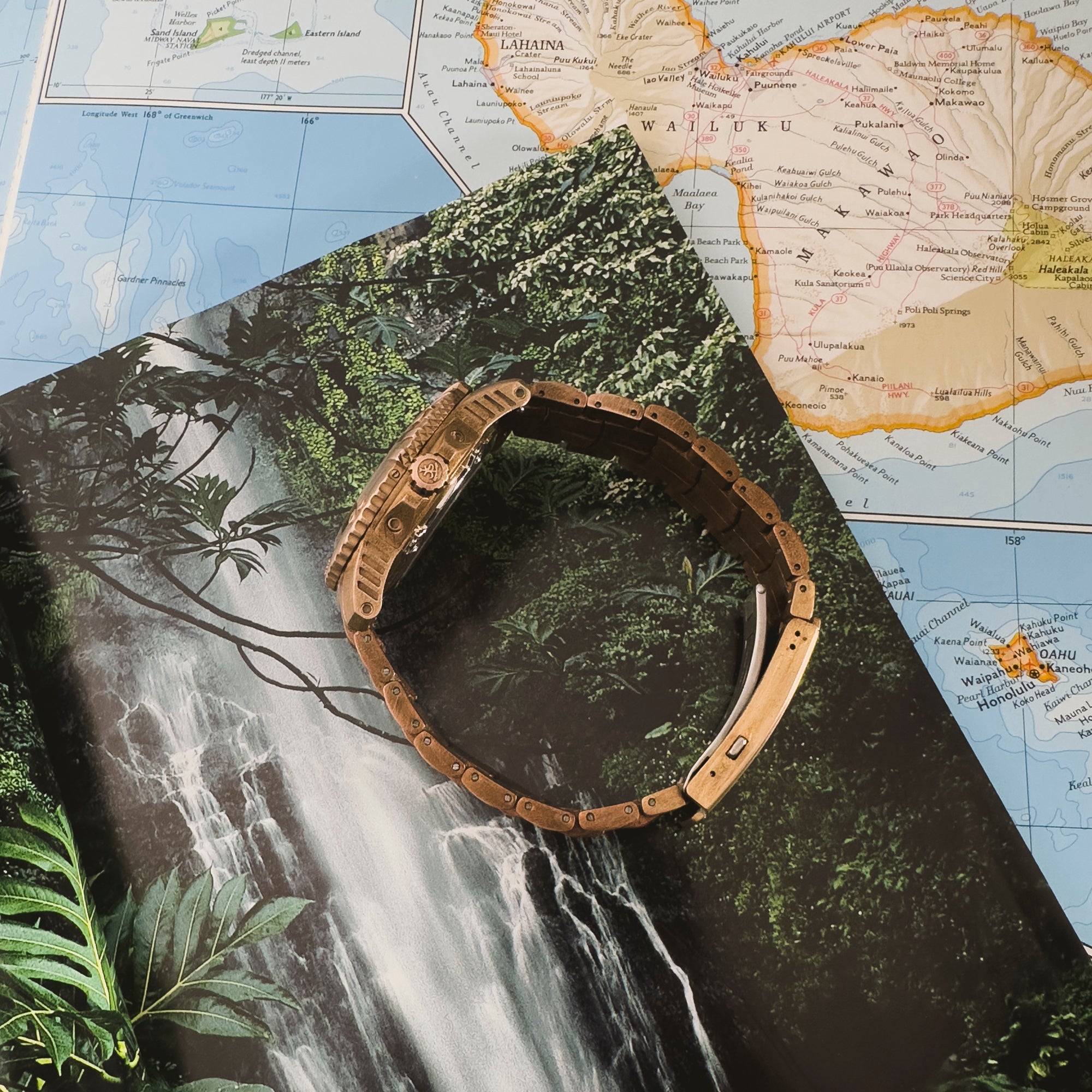 This custom made bronze watch features a dial and center link on the bracelet crafted from Koa wood that was received from a close friend. A fallen branch from a winter storm made its way to Encinitas, CA from the hills of Haiku as a token of ohana and the connection between craftsmen & watermen across the Pacific Ocean.