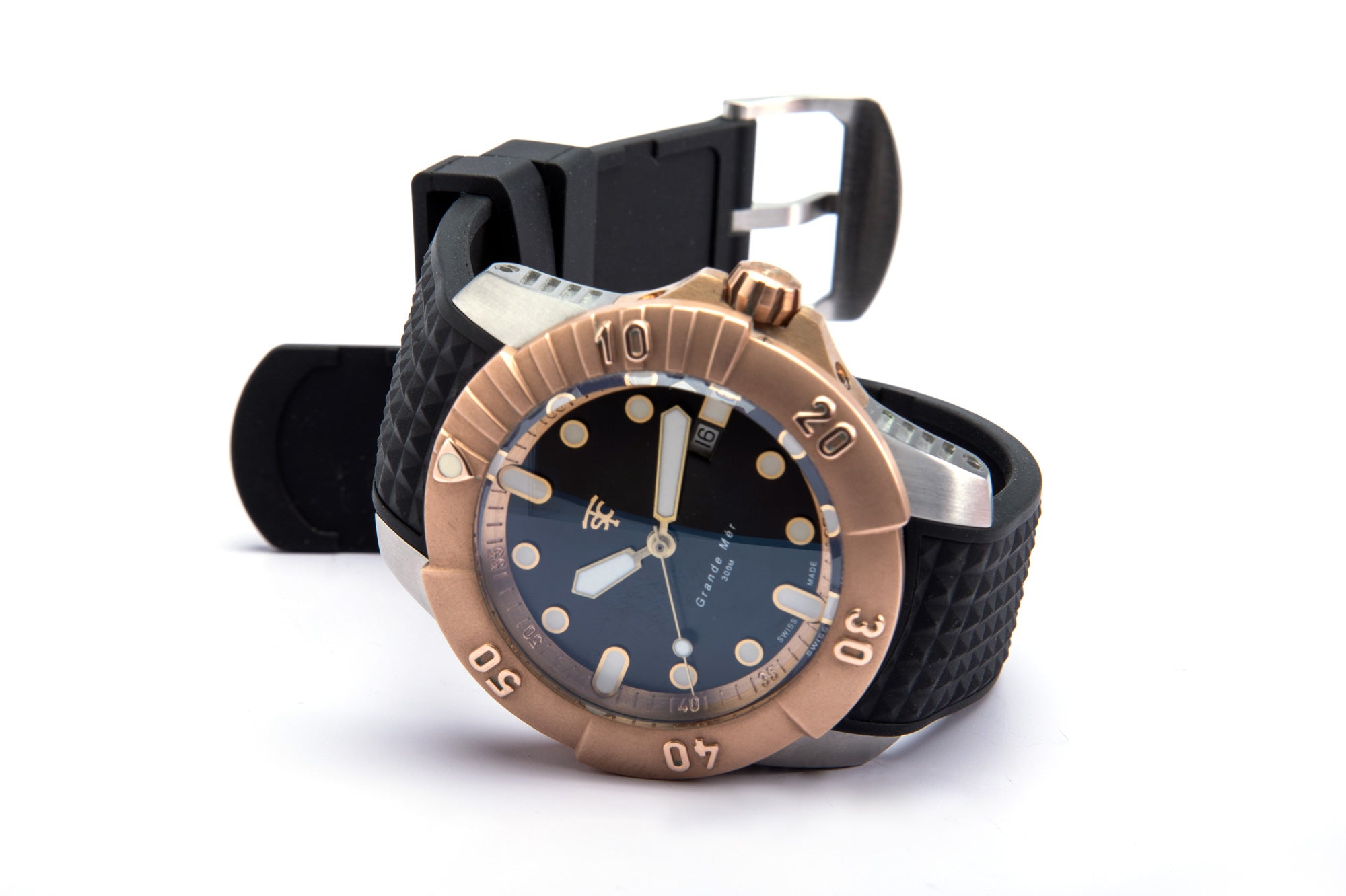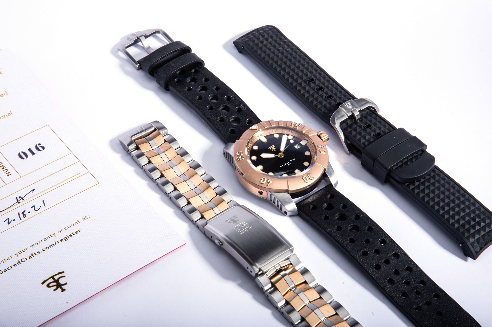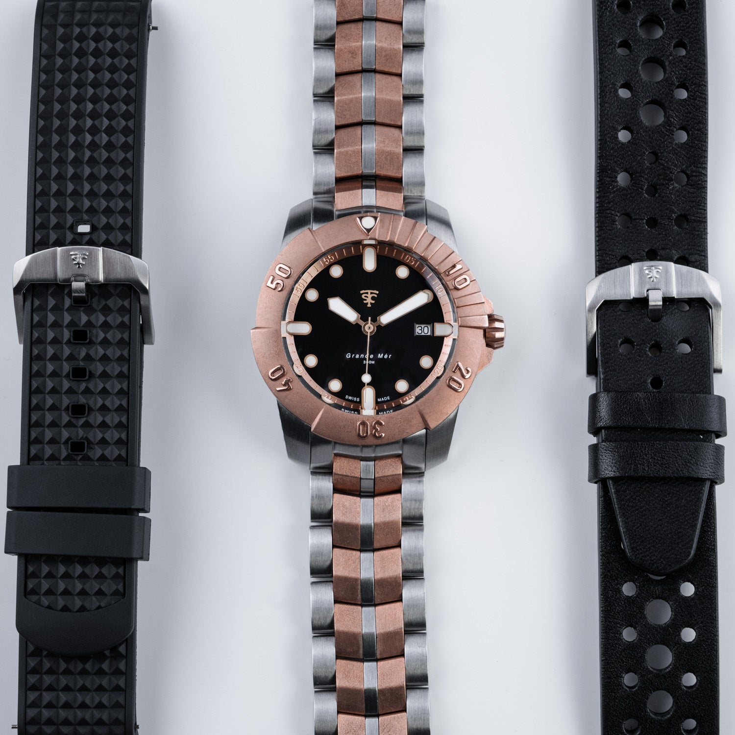 Each watch comes with an adjustable link bracelet, leather strap and a flourine rubber dive strap. Easy change with quick release pins.