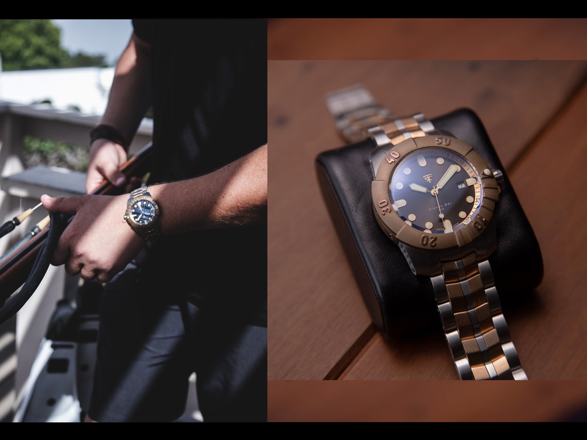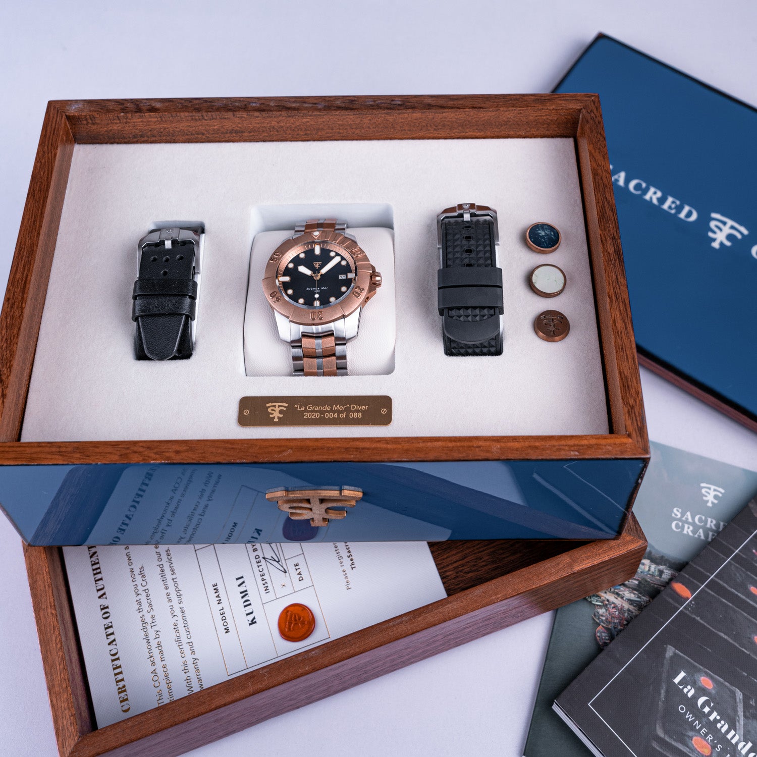 “Our Bronze” is a custom CuSN8 formulation we developed from reclaimed bronze marine propellors. Kudmai ships with a luxury reclaimed wood box made from our vintage boats, a rubber dive strap, premium leather band, travel case and coffee table book that shares the story of how [and why] we made this watch.