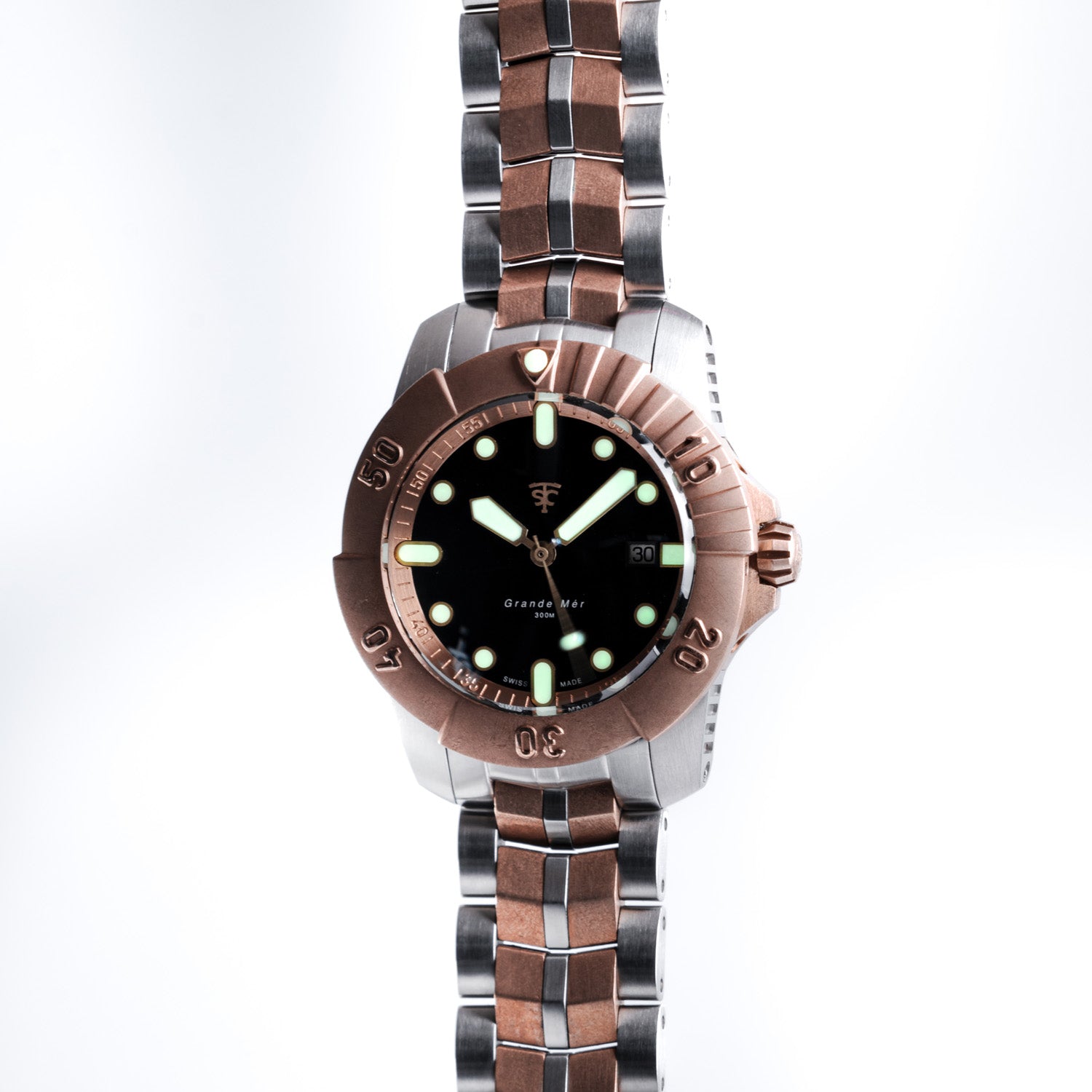 This watch combines our reclaimed bronze with Swiss-Made Automatic Movement. It is a humble nod to the classic dive watch. Featuring a 316L stainless steel case and bracelet + contrasting bronze bezel and center links made from vintage bronze marine propellers.