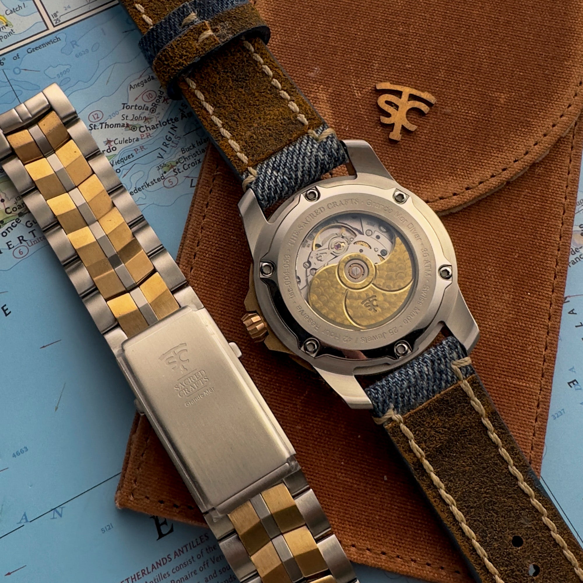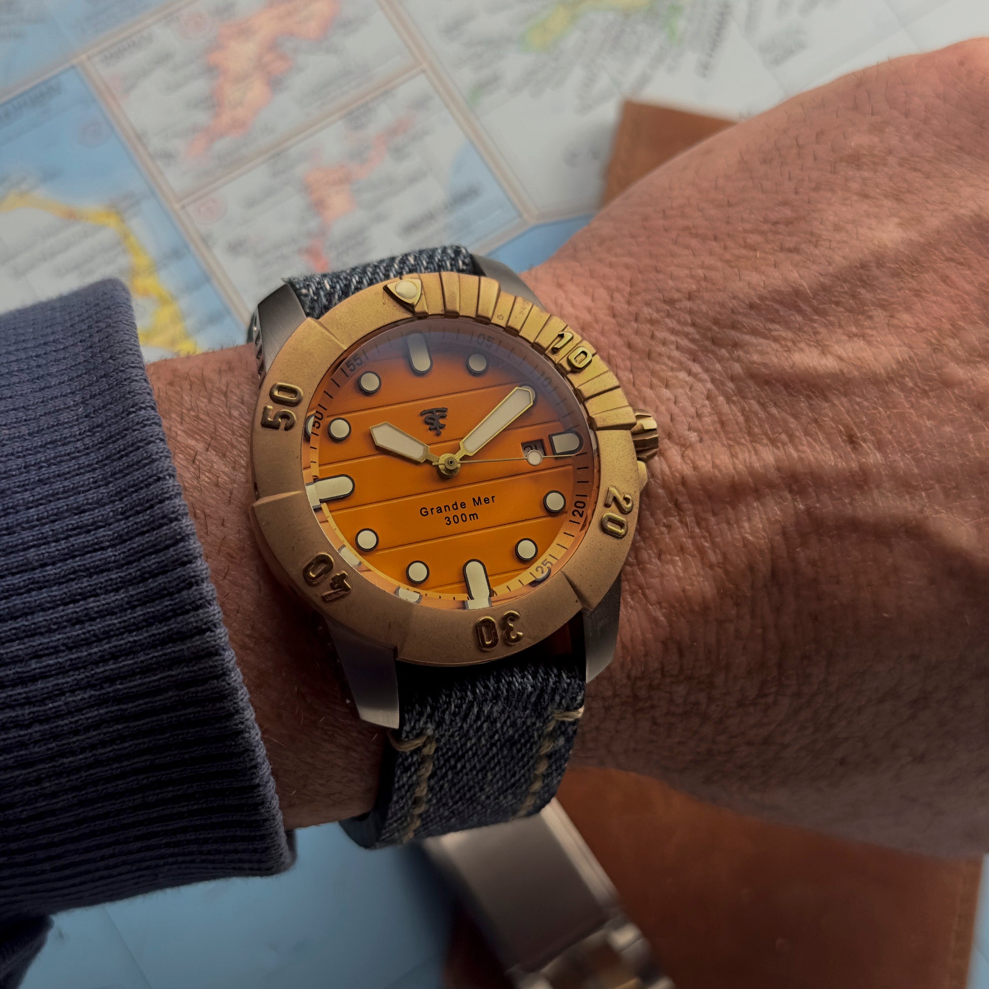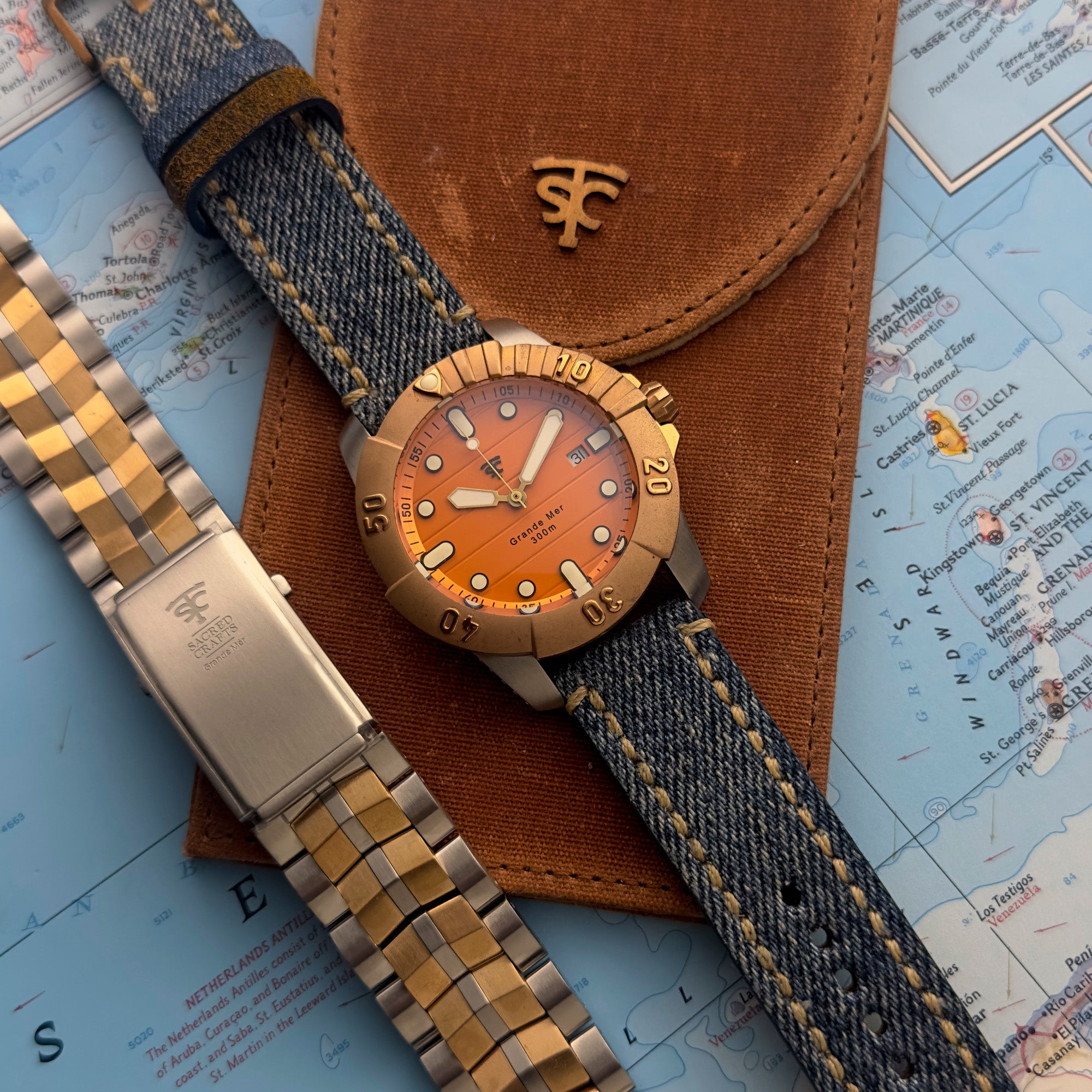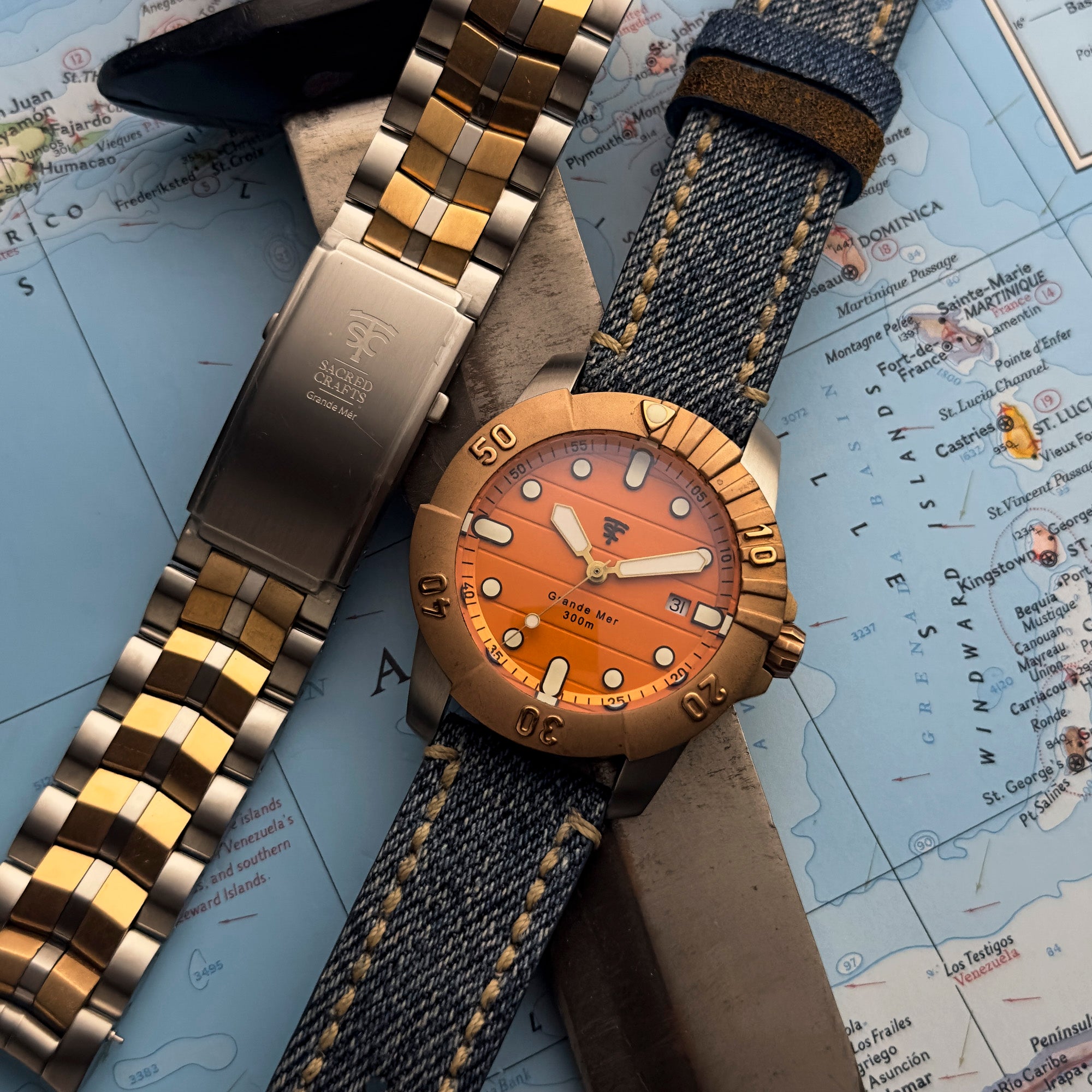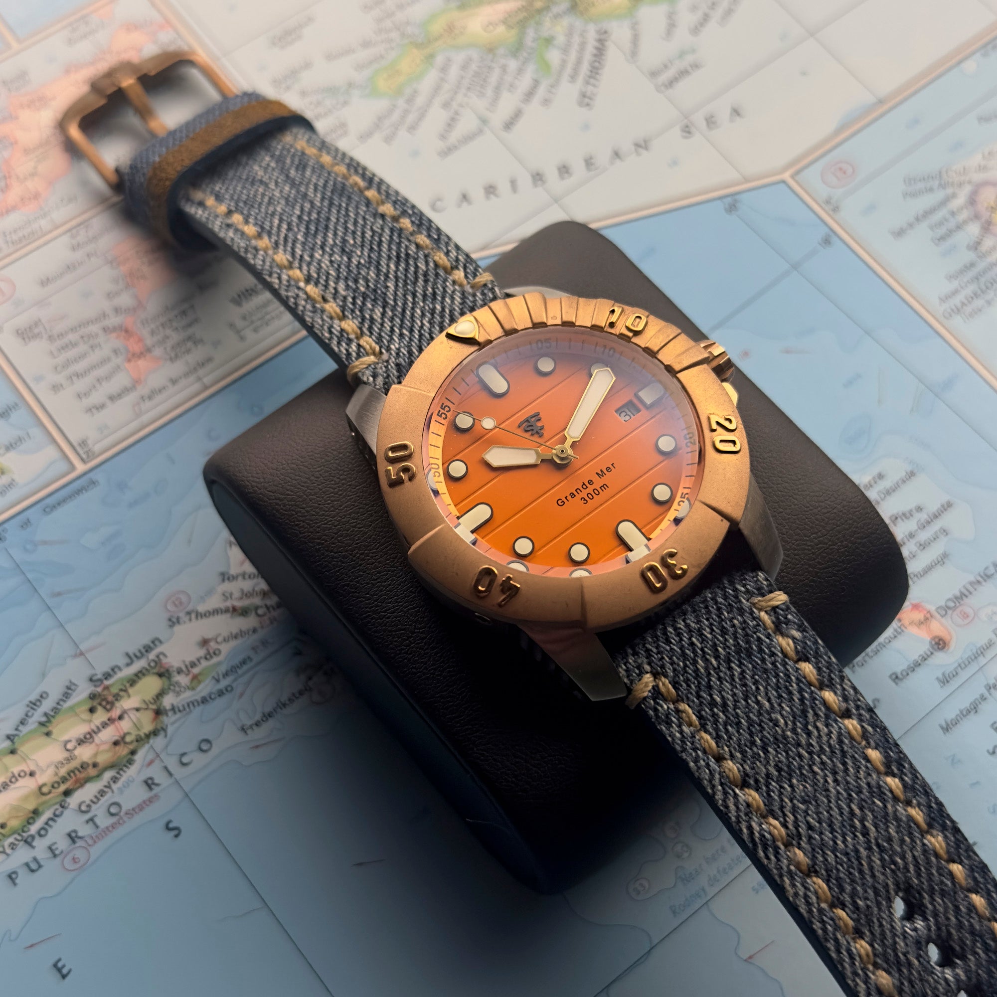 We added a mod vintage orange dial to pop against the two tone bronze & steel. Pair with a Denim Craftsman strap (as shown) for a rainbow of flavors on your wrist.