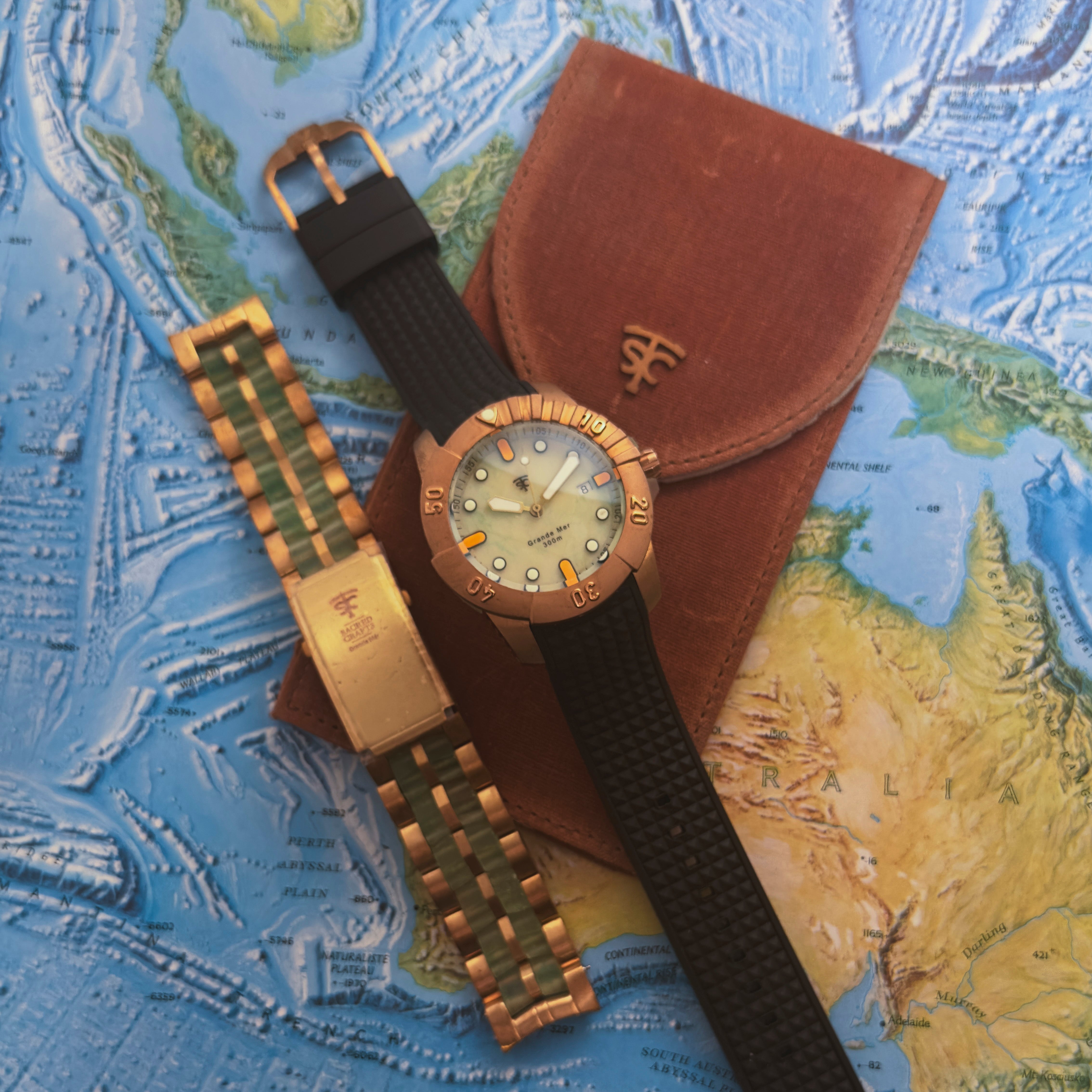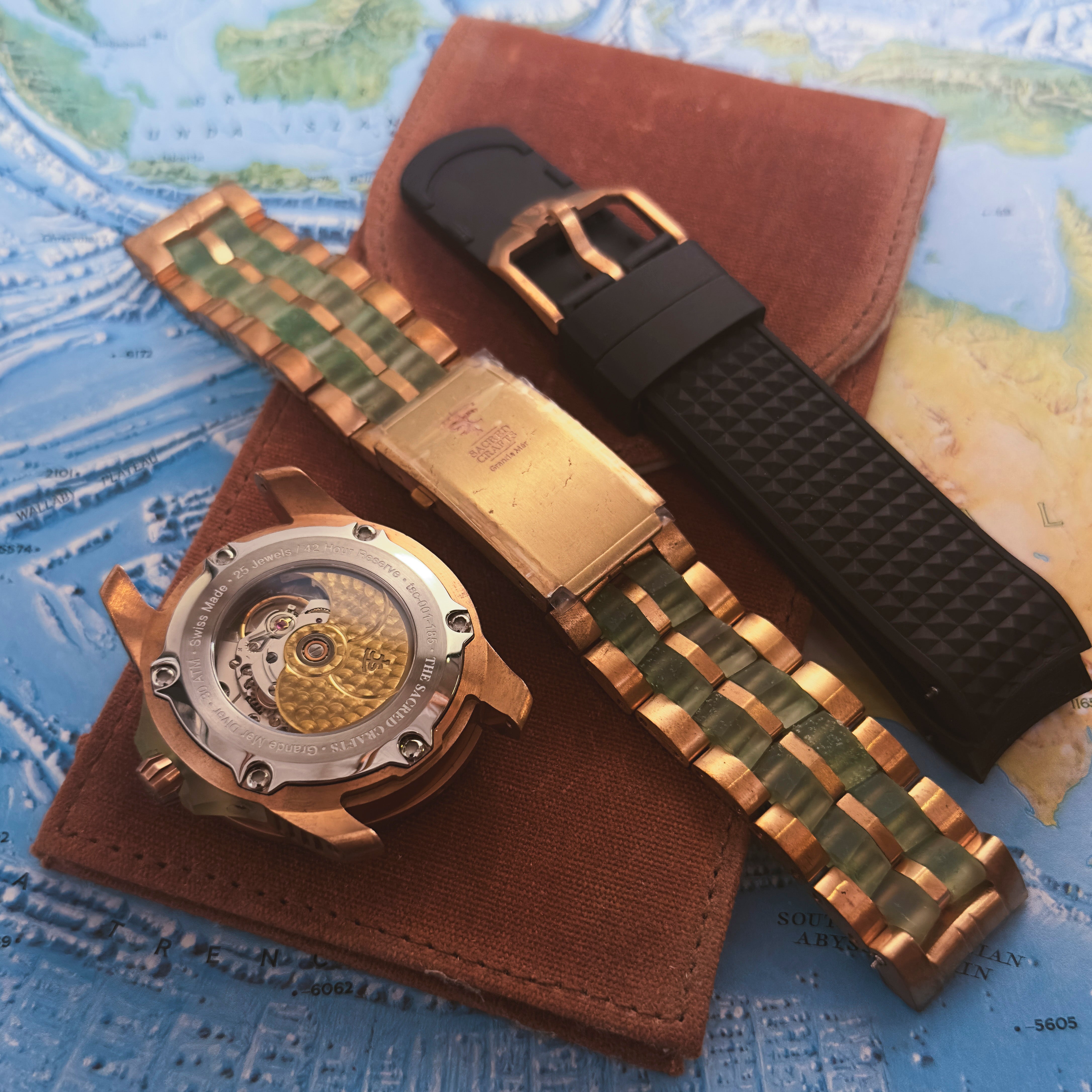 We added a jade green "Seaglass" dial (made from recycled Ghost nets) with color pop indices. Worn with the matching bracelet, the Seaglass look is dazzling. For more intense water activities, use the flourine rubber strap (as shown) and get busy!
